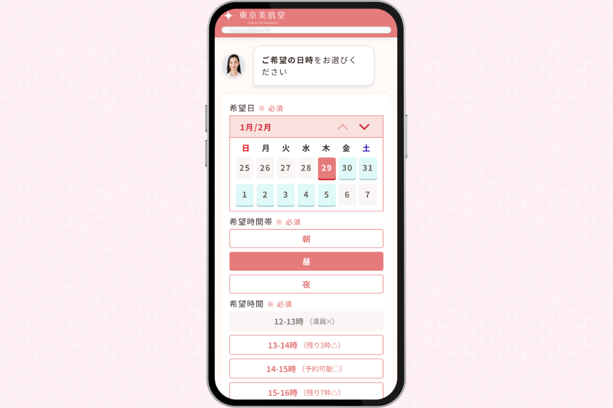 「これなら私でも続けられそう!」と確信でき、「医薬品にも関心があるんですが、診察の予約もお願いできますか?」と尋ねると、「このまま医師の診察へ進んでいただくことも可能ですよ!」とのご案内が。