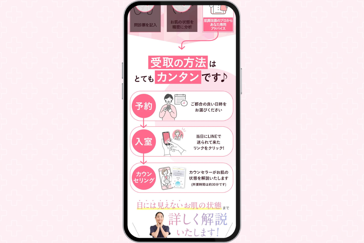 一言でいうと、カウンセラーさんが「私の味方になって、お肌の正解を一緒に探してくれる作戦会議」って感じなんです💡