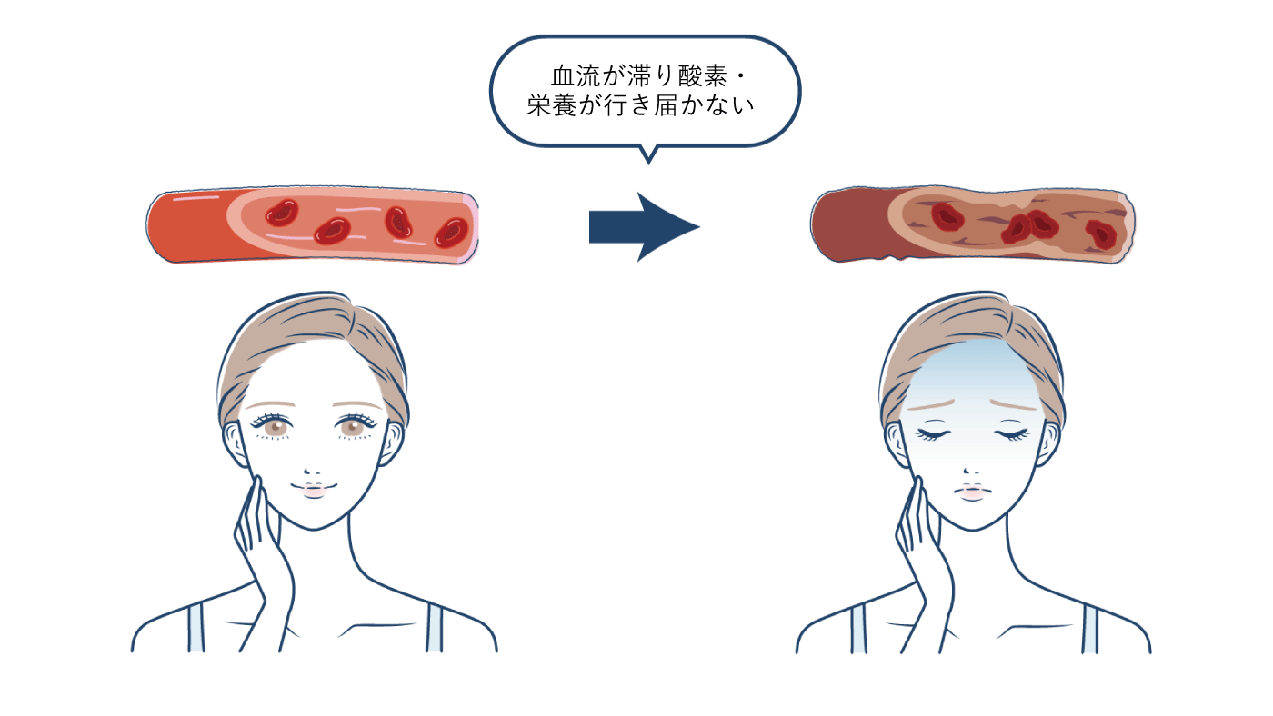 血流が滞ると、肌細胞に必要な酸素・栄養を行き渡らせることができず、くすみが発生します。