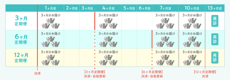 3ヶ月定期便 | 3ヶ月分のお薬を受け取ったあと、次回4ヶ月目以降分の発送日前々日18:00まで |