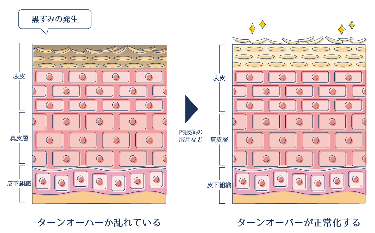 また、「ユベラ」など肌のターンオーバーを促進させる内服薬の服用も効果が期待されます。肌のターンオーバーは規則的な生活を送ったり、効果的な内服薬の服用などで整えることができます。