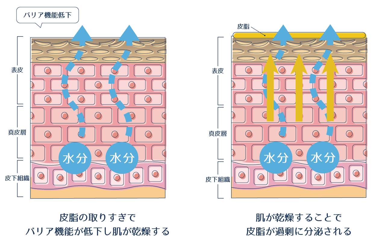 皮脂が少なくなると肌が乾燥し、水分量を保つためにより皮脂が分泌されます。