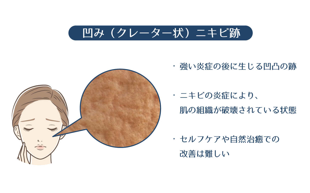 ニキビ跡の凸凹(クレーター状の跡)は、炎症によって肌の組織が破壊されることで生じます。