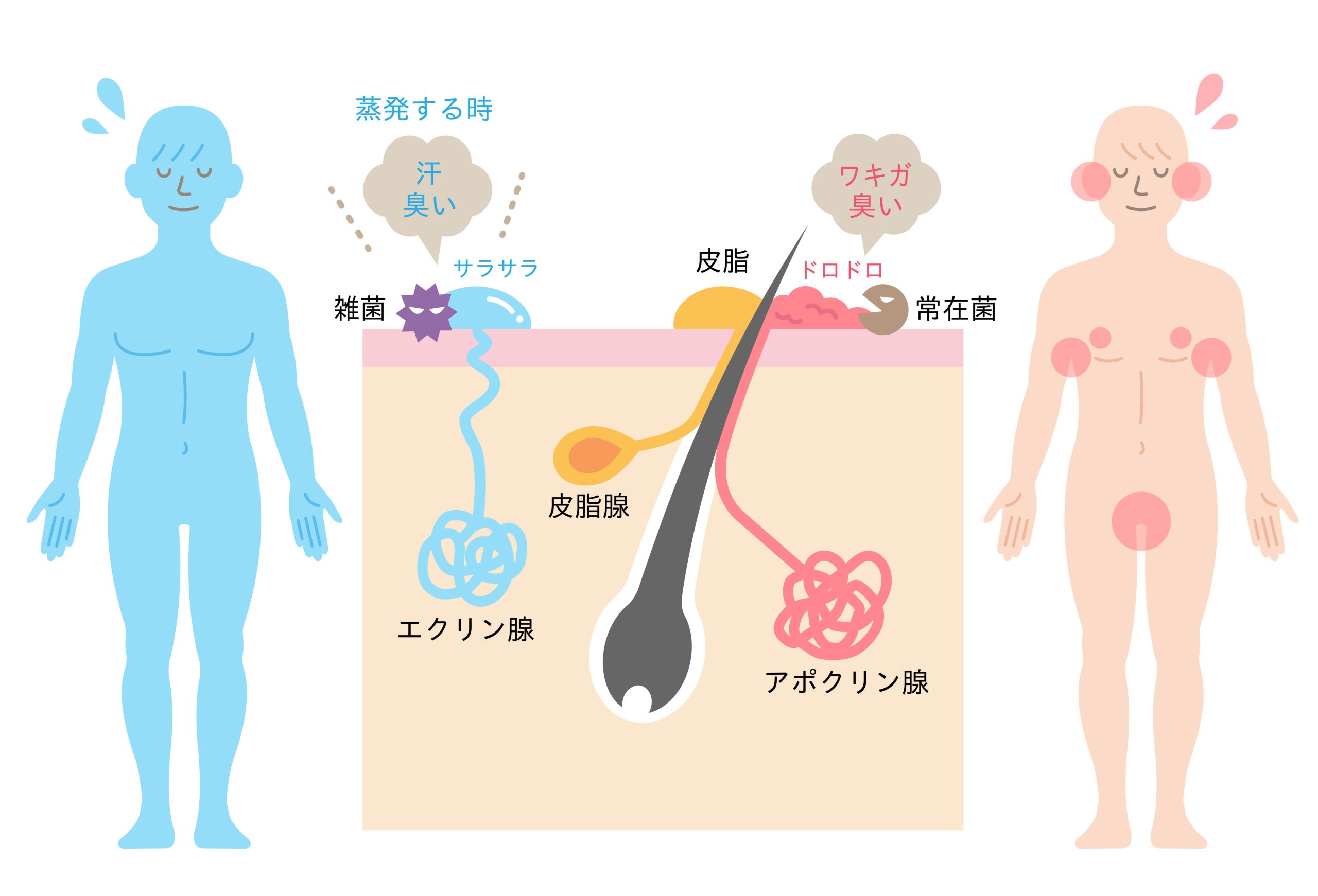 脇にアポクリン腺が多いと、たんぱく質や脂質などが増え、それを常在菌が分解することでニオイが強くなってしまいます。