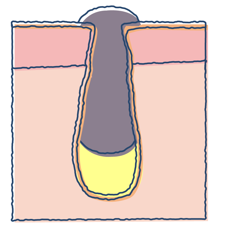 ・赤く腫れて大きめのしこりになることが多い ・中心に毛が見えることは少ない ・毛嚢炎より「1個が目立って大きい」ことが多い |