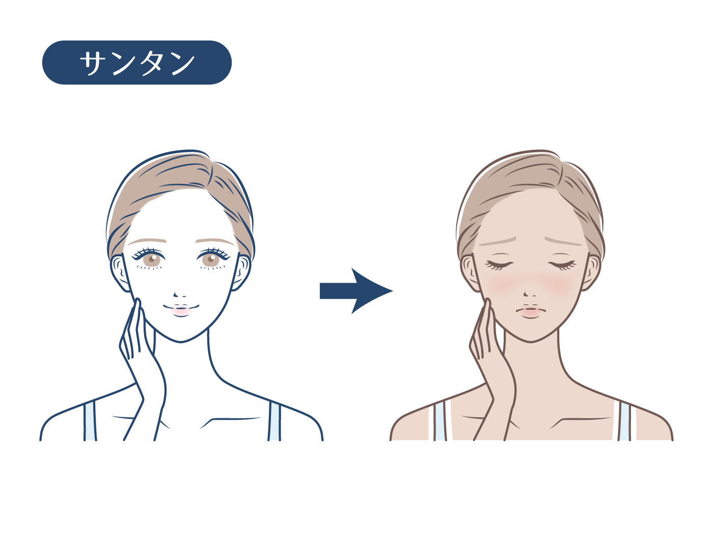 サンバーン(赤くなるタイプの日焼け)とサンタンのどちらも引き起こし、シミやそばかすの原因になります。